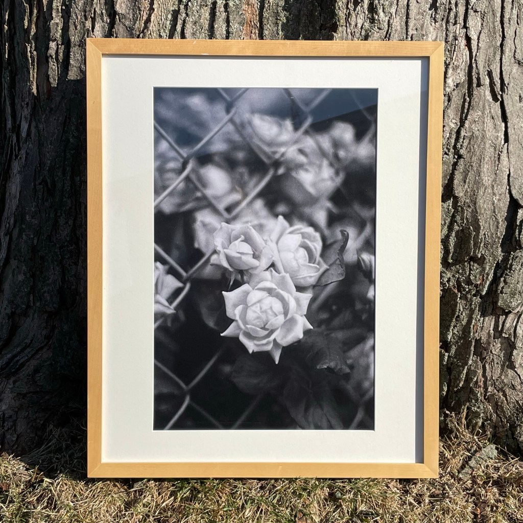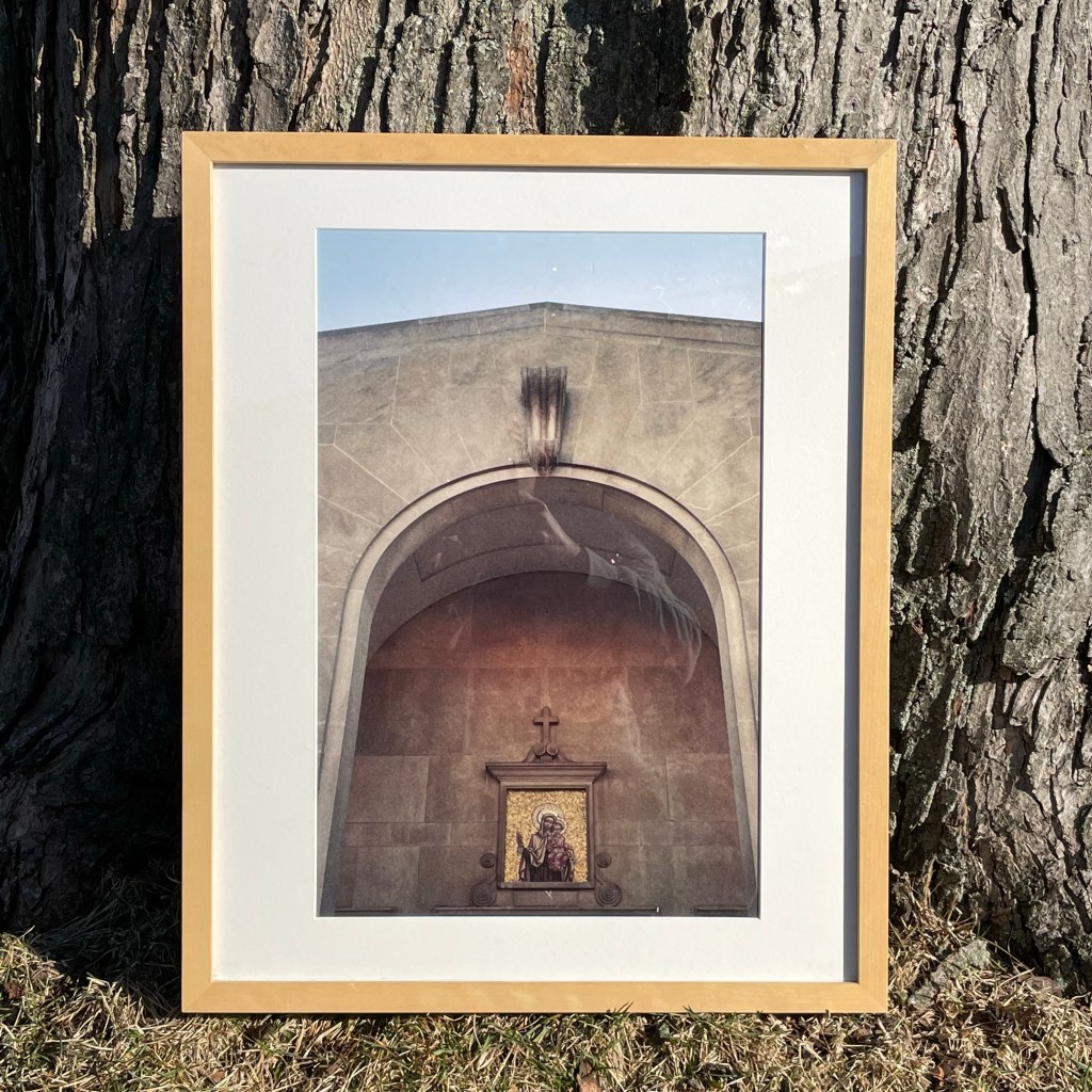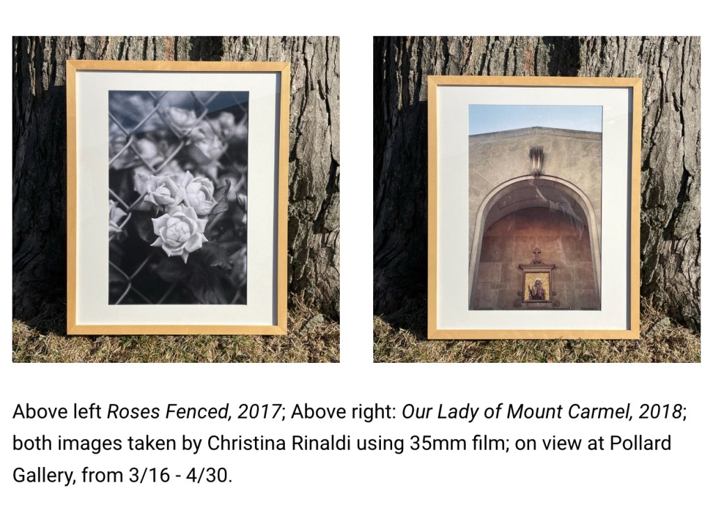 Above left Roses Fenced, 2017; Above right: Our Lady of Mount Carmel, 2018; both images taken by Christina Rinaldi using 35mm film; on view at Pollard Gallery, from 3/16 – 4/30.
