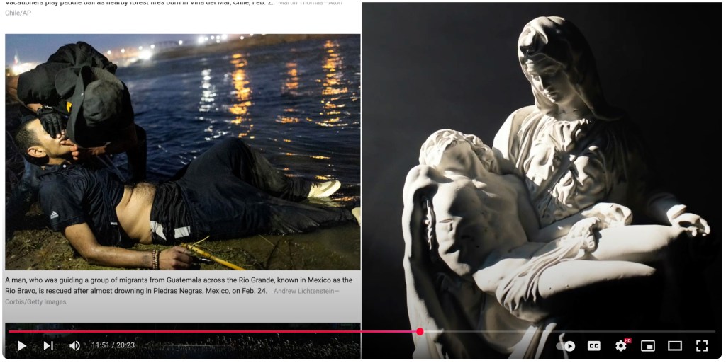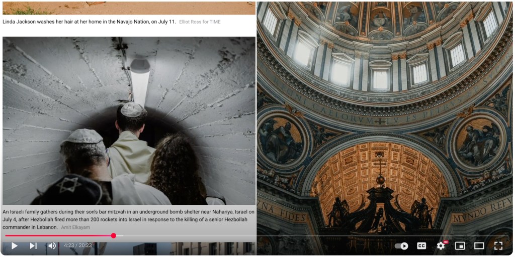 I took a detour before posting the curated video, and aimlessly checked my email. Somehow, I came across a photo that was part of the Time, Inc. 100 photos of 2024, and thought to myself, “That’s what’s missing”, and immediately recorded scrolling through the images, pausing to read each caption. I then placed that video parallel to the religious imagery video I had already created, and later found some rare occurrences when the images aligned.