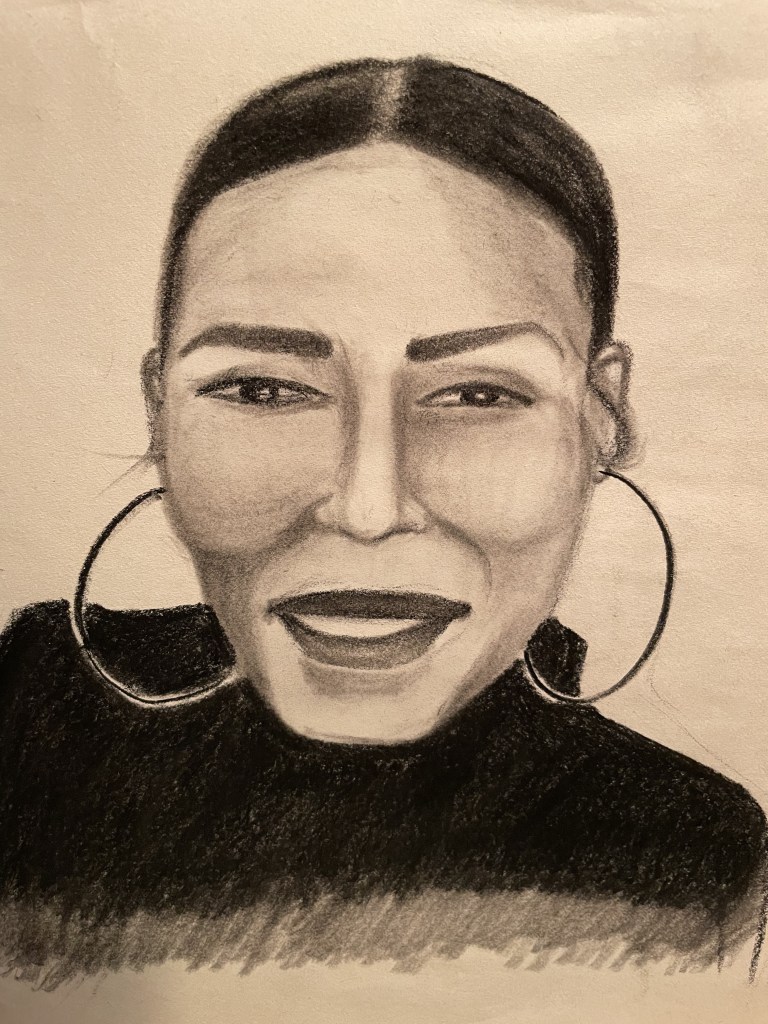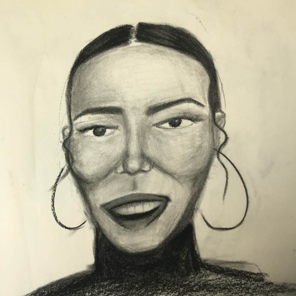 1-hour charcoal sketch of Melissa Young on newsprint, 2023.