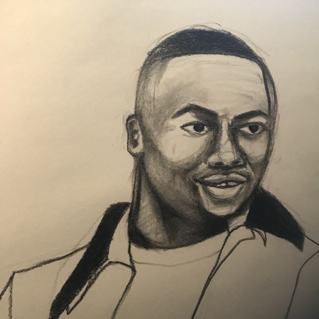 1-hour charcoal sketch of Vince Staples on newsprint, 2023.