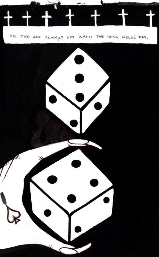 “Hot Dice”, 2019; black India ink on recycled CPG cardstock