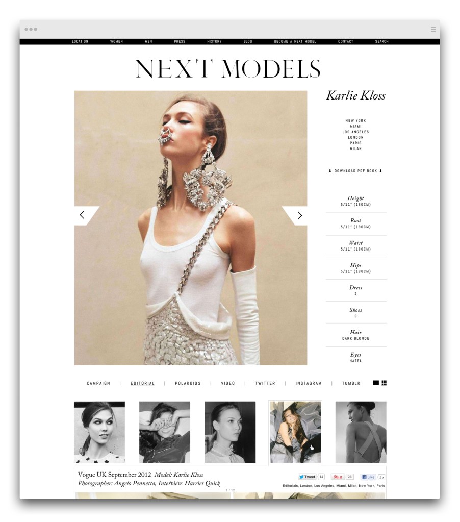 The clean, timeless layout of the NEXT Management website features profiles for their competitive roster of actors, artists, directors, models, musicians, producers, and stylists from New York, Paris, London, Milan, Los Angeles, Miami, and Madrid.